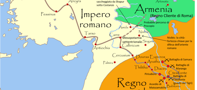 Una volta attraversate le montagne i due grandi fiumi sboccano su una fascia pedemontana abitabile a cavallo tra le moderne Siria, Iraq e Turchia. Questa fascia era dove si concentravano tradizionalmente le sfide militari tra Persia e Roma, visto che si tratta di un’area facilmente transitabile, a differenza delle montagne dell’Armenia, e senza problemi di approvvigionamento, a differenza del deserto siriano più a sud. Deserto quasi impassabile che formava la gran parte del confine tra i due imperi e che oggi è l’ampia area di confine tra Iraq e Siria. La fascia abitabile tra il deserto e le montagne, la Mesopotamia settentrionale, era stata conquistata da Diocleziano e fortemente fortificata. In particolare la grande fortezza di Nisibis era la chiave di volta del sistema di difesa costruito da Diocleziano per imbottigliare i persiani in Mesopotamia e impedirgli di invadere l’oriente romano, come avevano fatto con devastante successo durante la crisi del terzo secolo. Lo sapeva bene Shapur che aveva assediato Nisibis senza successo tre volte.