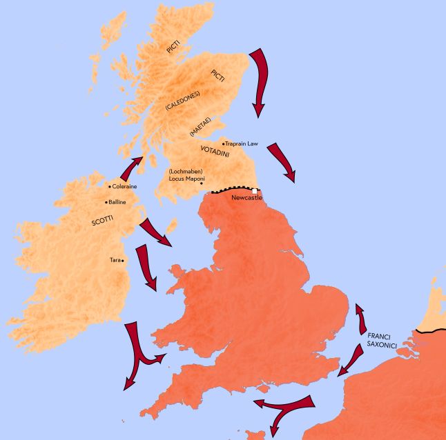 La Britannia Romana era il posto più noioso dell’impero dove essere un soldato: non c’erano grandi generali con prospettive imperiali, i barbari da affrontare erano gente da scorrerie, non da grandi invasioni, i reparti locali erano probabilmente i meno motivati e i peggio armati dell’Impero. L’Impero aveva avuto rogne in Britannia durante il terzo secolo e aveva costruito delle difese per proteggere la provincia contro le incursioni dei pirati Sassoni, oltre al grande vallo del nord che divideva la provincia dalle terre dei Pitti, nella moderna Scozia. Oltre uno stretto mare, nella selvaggia Ibernia, vivevano gli Scotii: ci si può confondere, gli Scotii vivevano in Irlanda. Le difese provinciali erano perfettamente in grado di rispondere ad ognuna di queste minacce, prese singolarmente. Ma i tempi stavano cambiando e presto l’isola sarebbe stata colpita dalla grande cospirazione.