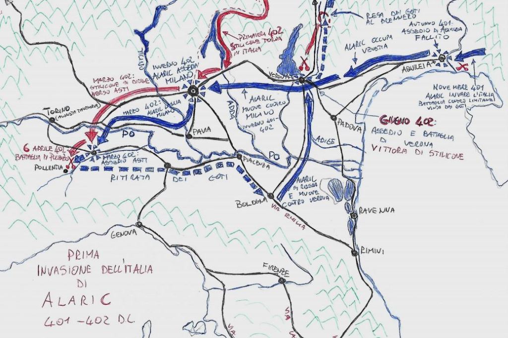 Superata Aquileia Alaric dilagò, in quell’autunno del 401, nella pianura padana saccheggiando ogni ricchezza mobile di quella ricca regione dell’Impero, regione che non vedeva una seria invasione da oramai più di un secolo. Occupata la provincia di Venetia et Histria, Alaric diresse il suo esercito in direzione di Milano, capitale dell’Impero Romano d’Occidente, con l’intento di espugnarla o perlomeno costringere l’Imperatore ad accettare la pace alle sue condizioni. Quando la notizia dell’invasione e del pericoloso avvicinarsi dell’esercito goto alla Capitale raggiunse la corte imperiale a Milano, l’Imperatore e i cortigiani, colti dal panico, presero in seria considerazione la possibilità di fuggire in Corsica o Sardegna, o, in alternativa, in Gallia, dove avrebbero potuto fondare una nuova Roma sulle rive della Senna o del Rodano: per fortuna a Milano era tornato di corsa, lasciando le sue truppe in Rezia, il generalissimo dell’occidente, Stilicone.