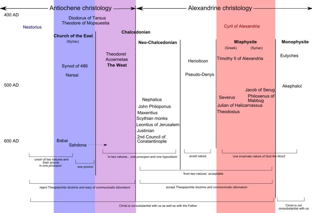 Spero di avervi confuso abbastanza, ma quello che dovete ricordarvi è: Antiochia, due nature divise e non confuse tra loro, Alessandria una natura fusione di una parte divina e una umana. E ora vediamo come queste fini discussioni teologiche, che apparentemente spaccano capelli in due, arrivarono a spaccare un impero in due.