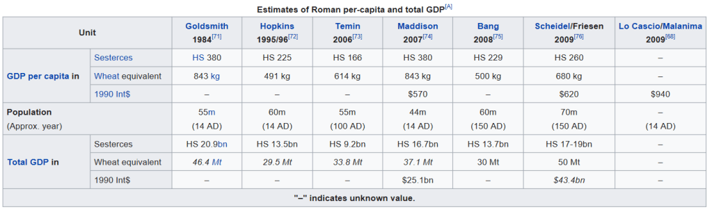 Sull’economia romana del suo periodo classico, diciamo dal secondo secolo avanti cristo al secondo dopo cristo, ci sono due filoni principali nella storiografia: non vi riassumo tutto il dibattito storiografico perché sarebbe troppo complesso, ma semplificando il campo si divide tra primitivisti e modernisti, entrambe etichette che nascondono ovviamente posizioni più complesse. I modernisti sostengono che l’Impero Romano aveva raggiunto un alto livello di sviluppo economico, paragonabile per certi versi con l’Europa occidentale all’alba della rivoluzione industriale. Di converso i primitivisti, che sono andati molto di moda a partire dagli anni 70’ grazie ad un monumentale studio di Moses Finley, sostengono che l’economia a base schiavistica dell’Impero Romano fosse in realtà una economia agraria piuttosto arretrata, forte nei volumi ma non nella specializzazione, dove le città erano più che altro consumatrici e non produttrici di beni e servizi, come saranno già nel basso medioevo. L’economia imperiale sarebbe stata limitata da scambi commerciali ridotti, scarso o nullo sviluppo del libero mercato e della finanza, mancanza di sviluppo tecnologico.
