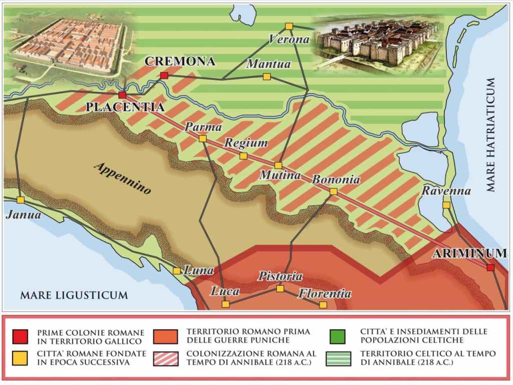 La strategia messa in campo dai romani per conquistare la Pianura Padana può essere paragonata a quella che vediamo rappresentata nei film western, dove le Giubbe Blu si spingevano all’interno di un territorio controllato dai nativi, vi fondavano un presidio fortificato e, successivamente, avviano campagne di assoggettamento e conquista del territorio circostante richiamando quindi coloni ad occuparlo.