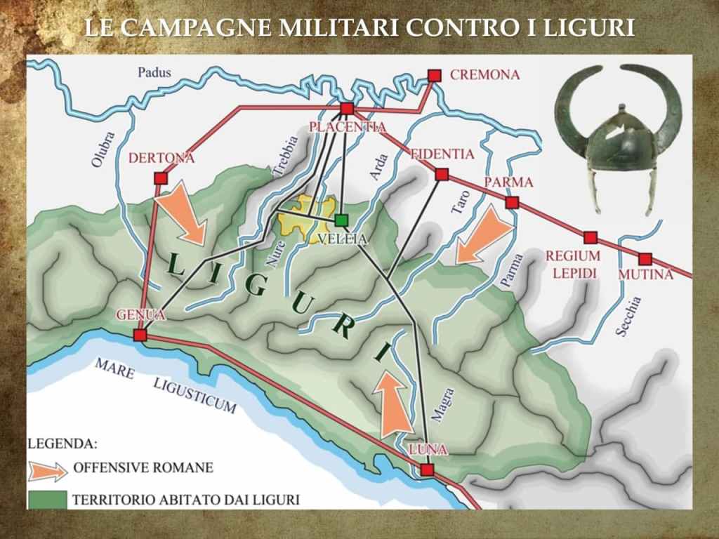 Roma impiegò circa 80 anni per domare queste fiere genti appenniniche e in particolare nel 158 a.C. il proconsole Fulvio Nobiliore, trionfando sulla tribù dei Ligures Veliates poneva fine alle guerre contro i Liguri fondando la città di Veleia, nel cuore di questa tribù, su di un centro indigeno preesistente (forse l’insediamento principale dei Veleiati). Ancora oggi è possibile visitare una parte di questo insediamento appenninico situato nel comune di Lugagnano Val d’Arda a pochi chilometri da Piacenza… ma questa è un’altra storia!