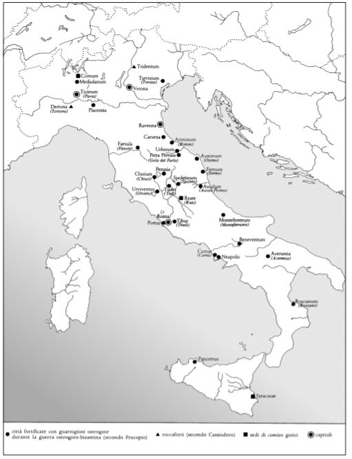 Ma dove furono sistemati gli Ostrogoti? In generale le testimonianze archeologiche puntano verso regioni dell’Italia centro-settentrionale, qualcosa di coerente con la difesa dell’Italia, le cui minacce principali venivano da nord e da est. I Goti erano certamente presenti in tre aree principali: la prima era la Liguria tardo-imperiale, ovvero la regione intorno a Pavia, la capitale militare dell’Italia, oltre che varie località dell’arco alpino e del Piemonte, tra le quali Tortona, una città dove Teodorico fece costruire un’importante fortezza. La seconda zona era quella intorno ad un’altra città che sarà molto amata da Teodorico: ovvero Verona. I Goti erano stabiliti in tutta la Venetia, con insediamenti sparsi verso il moderno Friuli e il Trentino: a Trento, a guardia della valle dell’Adige, Teodorico fece costruire un’altra fortezza su una collina che domina la città, il Doss Trento. Infine la terza area era la costa adriatica, a partire da Ravenna e giù fino alle moderne Marche e Abruzzo settentrionale. Non a caso le tre capitali di Teodorico, le città con un palazzo reale, saranno Pavia, Verona e Ravenna.