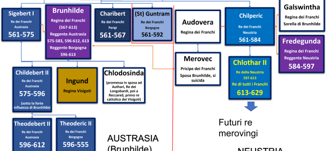 In questo articolo, analizziamo la confusa situazione della Faida reale, che contrappose per decenni l’Austrasia e la Neustria, dalla morte di Chlothar I (561) a quella di Brunhilde (613).Un cinquantennio di guerre civili. Vi rimando all’episodio relativo per più dettagli.