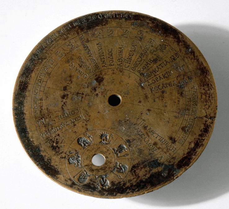 Nel tardo impero si affermarono delle meridiane “portatili” che servivano a calcolare le ore in qualunque regione dell’Impero. Ne sono stati trovati diversi esemplari, come questo in greco, cosa che ci fa ritenere che fossero piuttosto comuni. In questo modo, potevano essere utilizzate per conoscere l’ora nelle varie regioni dell’Impero: per esempio qui si può leggere “Costantinopoli, Roma, Antiochia, Askalon (Egitto), Palestina, Cesarea, Dyrrachium (Durazzo), Dalmazia, Thessalonika, Sicilia, Atene, Rodi, Alessandria, Africa, Tebaide (Egitto)”