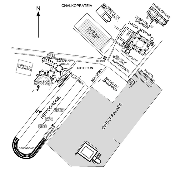 Prima di passare all’azione una nota di spiegazione sui luoghi: la geografia di Costantinopoli non è familiare ai più e ho postato una mappa sul sito in modo da permettervi di seguire l’azione. Se non avete l’opportunità di guardarla considerate questo: il centro della nostra storia è l’Ippodromo di Costantinopoli, nel cuore della penisola sulla quale giace la capitale dell’impero. Collegato al circo con un passaggio riservato all’imperatore c’è il vasto complesso palatino. A nord del circo c’è l’Augusteion, una piazza porticata rettangolare sulla quale si affacciano l’ippodromo a sud, a est l’ingresso monumentale al palazzo – la porta Chalke – e la sala del Senato imperiale, a nord la cattedrale di Costantinopoli, l’Haghia Sophia di Teodosio, non ancora l’attuale Haghia Sophia. A ovest dell’Augusteion parte il grande viale porticato che forma l’asse portante della città: la Mesi. Viaggiando verso ovest lungo la Mesi ci si allontana dal centro e si va in direzione delle grandi mura teodosiane: a poca distanza dall’Augusteion c’è la più monumentale delle piazze costantinopolitane, il foro di Costantino, una piazza quasi circolare con archi di trionfo ad ogni ingresso della Mesi.