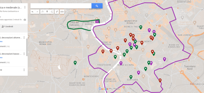 La città tardoantica (monumenti in viola) era in realtà molto vasta e, fino al regno di Teodorico, occupava ancora gran parte della città antica, che era ancora del tutto leggibile. Ho deciso di inserire i monumenti della Roma tardoantica tra quelli “medievali” perché spesso così sono percepiti, in quanto in larga parte si tratta di chiese cristiane.
