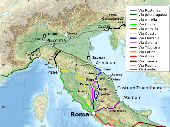 Ho iniziato qualche mese fa a descrivere una ad una le vie romane d’Italia, perchè queste hanno un ruolo importante non solo nella narrazione dell’epoca tardoantica, ma anche altomedievale, visto che restano gli assi portanti del popolamento della penisola.