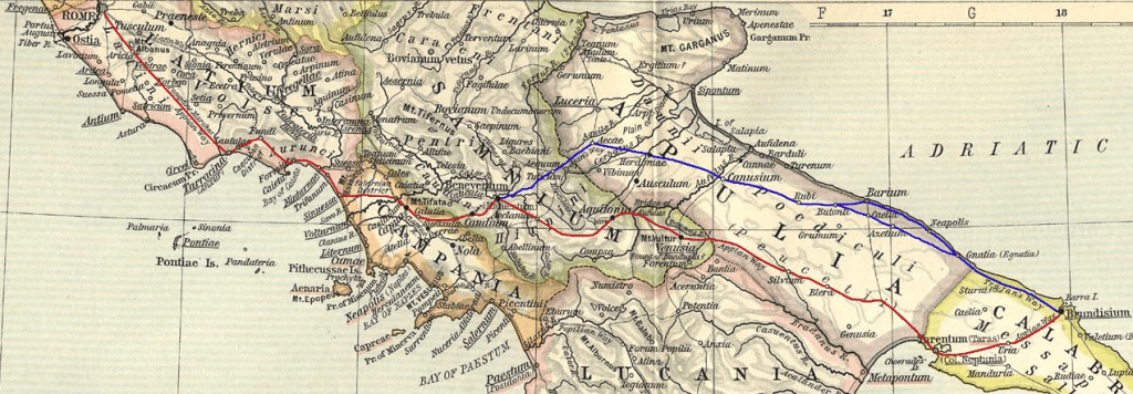 La via Appia fu costruita da Appio Claudio Cieco – console nel 312 a.C. e a sua volta era un’alternativa più diretta e rapida al più antico tracciato della via latina, che invece passava più all’interno (non lontano dal tracciato della moderna A1). In epoca imperiale, però, Traiano decise di costruire un’alternativa alla via Appia che permettesse una ancora più rapida connessione con Brindisi. La sua costruzione fu celebrata con un grande arco a Benevento e perfino con l’emissione di monete
