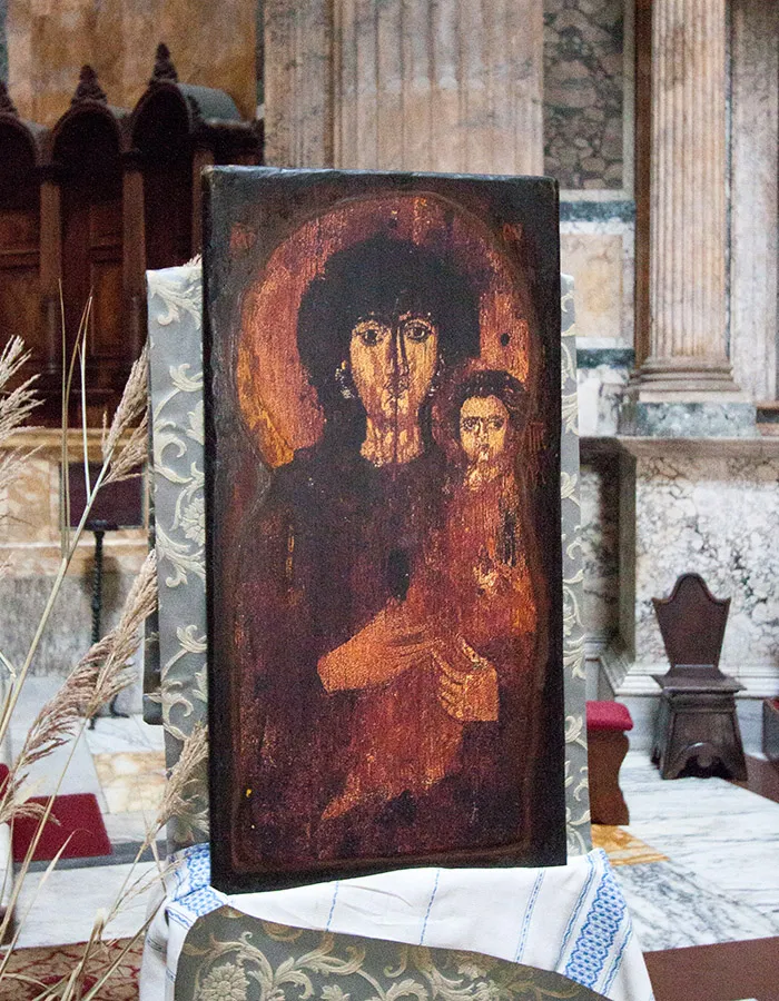La Madonna di «Sancta Maria ad Martyres» detta Madonna di San Luca al PANTHEON – Dipinto con colori a caseina su tavola di olmo più vicina all’area greco-siriaca. Il Pantheon venne consacrato a chiesa nell’anno 609, ed è probabile che questa icona facesse parte degli omaggi offerti in quell’occasione dall’imperatore Foca, la Vergine è una donna semplice ed intensa, con caratteristiche simili alla ritrattistica romana. In realtà questa “icona” è troppo naturalistica per essere un’icona appunto ma parrebbe una statua lignea a tutta figura segata sotto al busto di derivazione della pittura dei sarcofagi dipinti romano-orientali.