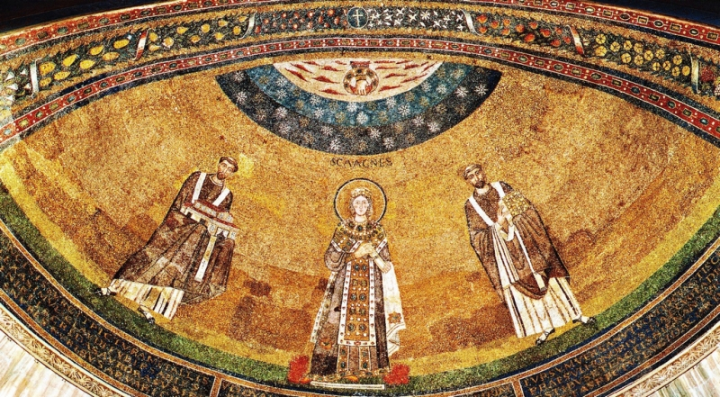 Non possiamo completare il nostro giro attorno al VII secolo senza parlare dell’arte dell’epoca: l’anello di congiunzione mancante tra la rinascita Liutprandea e carolingia dell’VIII secolo e la magnificenza dell’arte bizantina ravennate. Per farlo, viaggiamo soprattutto a Roma, per visitare due chiese molto particolari: S.Agnese sulla Nomentana e S.Maria Antiqua.