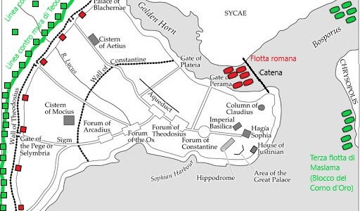 Ma la battaglia di Costantinopoli fu assai più complessa perfino di Alesia, perché coinvolse anche il mare: Maslama arrivò a schierare ben tre flotte, una a bloccare il Mar di Marmara a sud, una per bloccare il Bosforo (e l’accesso al Mar Nero) a nord, un’altra per bloccare il Corno d’Oro e imbottigliare la flotta romana, oltre che impedire l’uscita dei pescatori.