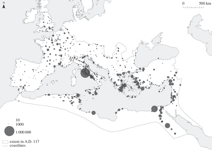 Figura 3: Mappa della distribuzione demografica nelle città all’inizio del II secolo d.C.