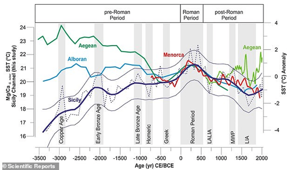 Figura 1: Ricostruzione della temperatura media di superfice (SST) in diversi punti del Mar Mediterraneo, ottenuta grazie ai sedimenti di magnesio e calcio. Notare l’aumento medio durante gli anni dell’Optimum Climatico Romano.