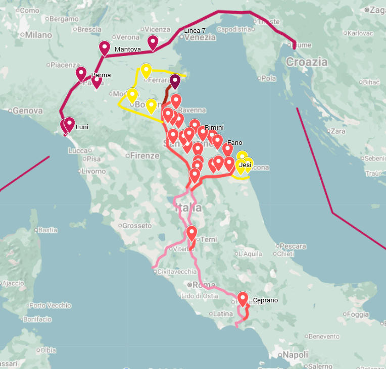 Nel 754, dopo il viaggio di Stefano II in Franchia, la sottoscrizione dell’alleanza franco-papale e la prima sconfitta di Astolfo, Pipino il breve “donò” a San Pietro i territori in rosso. Ho segnato sulla mappa tutte le città e territori citati dal liber pontificalis e corrispondenti in sostanza al vecchio esarcato, assieme a Narni e Ceccano. Questi sono realisticamente i territori realmente richiesti dal papato fino alla distruzione del regno longobardo. Da notare che queste donazioni (o “restituzioni” nel linguaggio diplomatico papale) rimasero in sostanza sotto controllo longobardo.