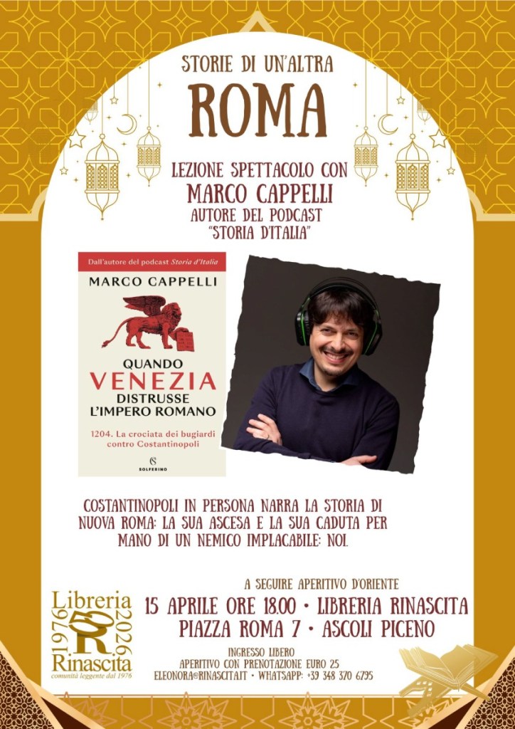 Una serata particolare! Il 15 aprile, ad Ascoli Piceno, presento la seconda replica di “Storie di un’altra Roma”, il mio monologo teatrale: Costantinopoli in persona vi narrerà la storia di Nuova Roma: la sua ascesa e la sua caduta per mano di un implacabile nemico, noi.
