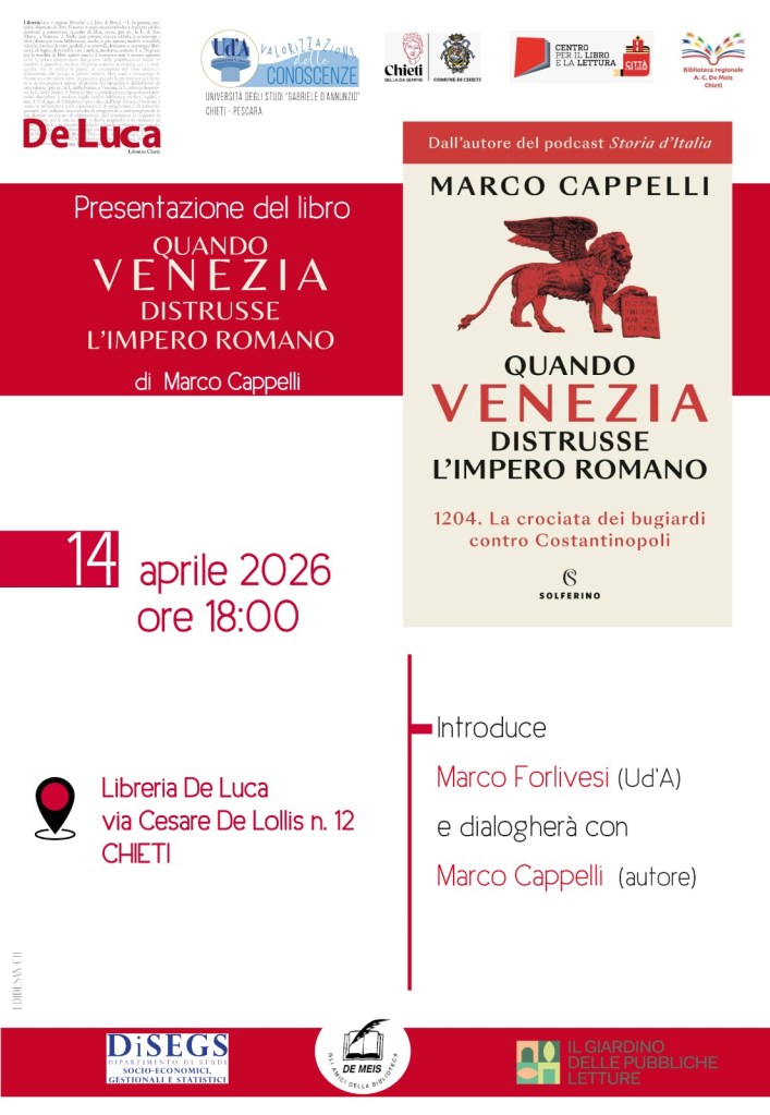 Presenterò “Quando Venezia distrusse l’Impero romano” con l’Università di Chieti.