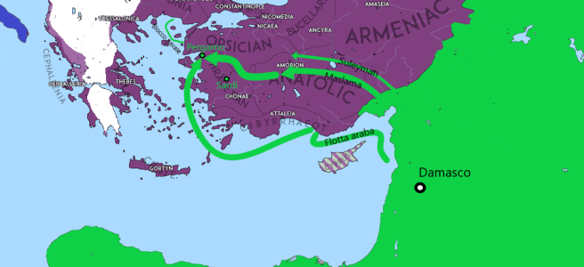 Mappa della situazione nel Mediterraneo orientale, come narrato nell'episodio 168 La manovra a tenaglia del 716 porta gli Arabi alle porte di Costantinopoli. Culmine di anni di preparativi, nel 716 due eserciti Arabi muovono all'assalto dell'Impero romano dalle loro basi in Cilicia. Il primo (piรน piccolo) รจ comandato da Suleyman e giunge per assediare Amorion: … Leggi tutto 716: gli arabi muovono per strangolare Costantinopoli