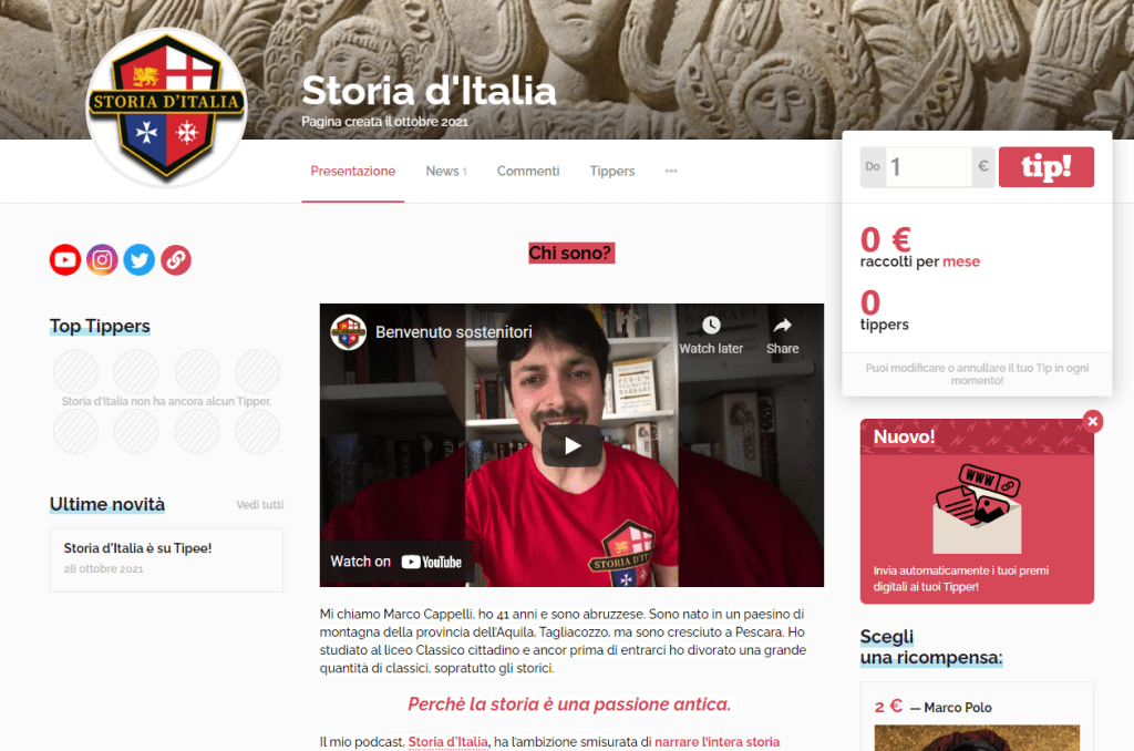 Ho aggiunto la possibilità di sostenere Storia d’Italia anche su Tipeee! Si tratta di una piattaforma molto semplice da utilizzare e che permette di lasciare una “tip” (mancia) di qualunque importo in modo molto semplice. La donazione può essere sia una tantum, che periodica.