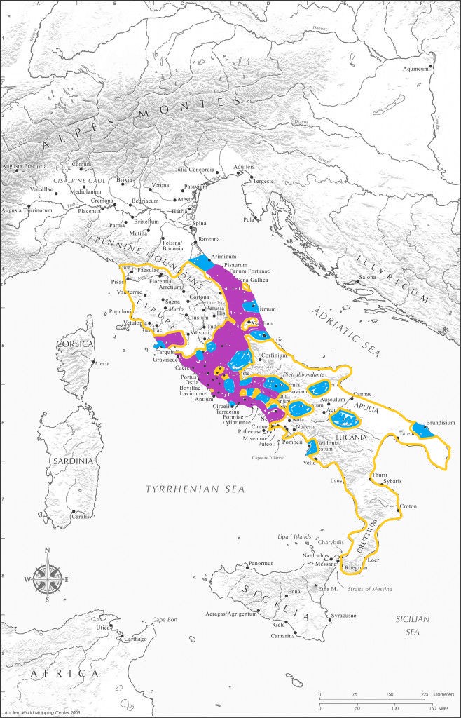 Questa è una mappa della situazione dell’Italia prima della II guerra punica: in viola il territorio romano, in blu le città e colonie latine, in giallo il territorio degli alleati italiani.