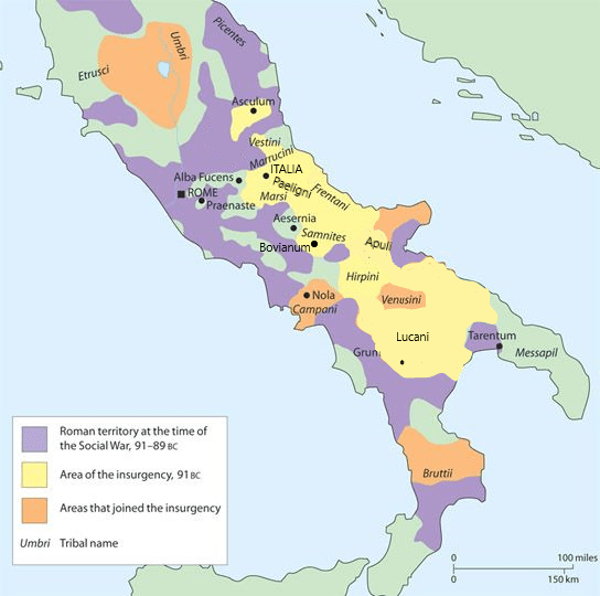 In giallo (ho modificato leggermente la mappa) i territori che si unirono immediatamente alla rivolta italiana. In arancione popoli che si unirono in un secondo momento. In viola il territorio propriamente romano, in verde alleati e latini rimasti fedeli a Roma