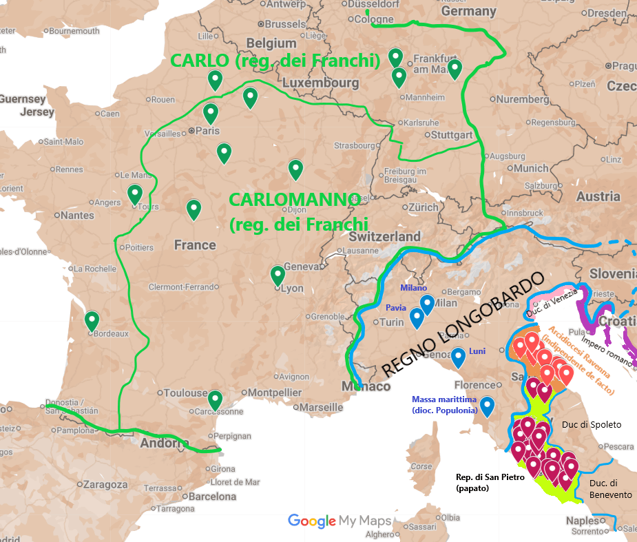 - Il regno Longobardo (BLU+AZZURRO), tornato ad essere dopo una breve pausa seguita alla seconda sconfitta di Astolfo la più importante forza politico-militare con sede in Italia